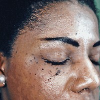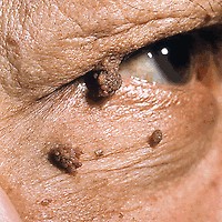 Dermatosis papulosa nigra (DPN), kas ir viena no SK klīniskajām formām un izpaužas kā nelieli tumši veidojumi ap acīm un vaigiem cilvēkiem ar tumšāku fototipu.