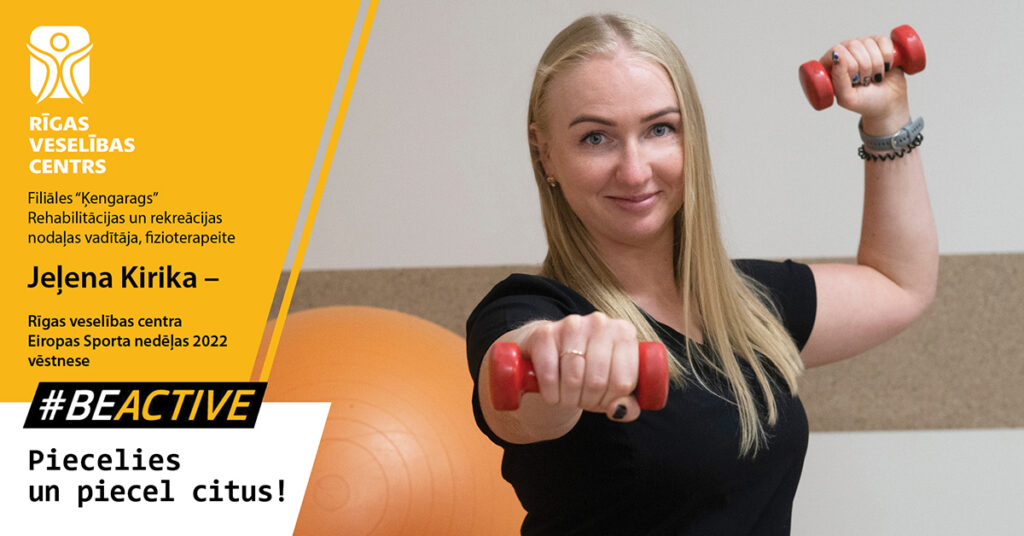 SIA “Rīgas veselības centrs” Eiropas Sporta nedēļas vēstnese, fizioterapeite, filiāles “Ķengarags” Rehabilitācijas un rekreācijas nodaļas vadītāja Jeļena Kirika aicina palikt aktīviem, brīvos brīžos piecelties un veikt vienkāršus līdzsvara un koordinācijas vingrojumus: