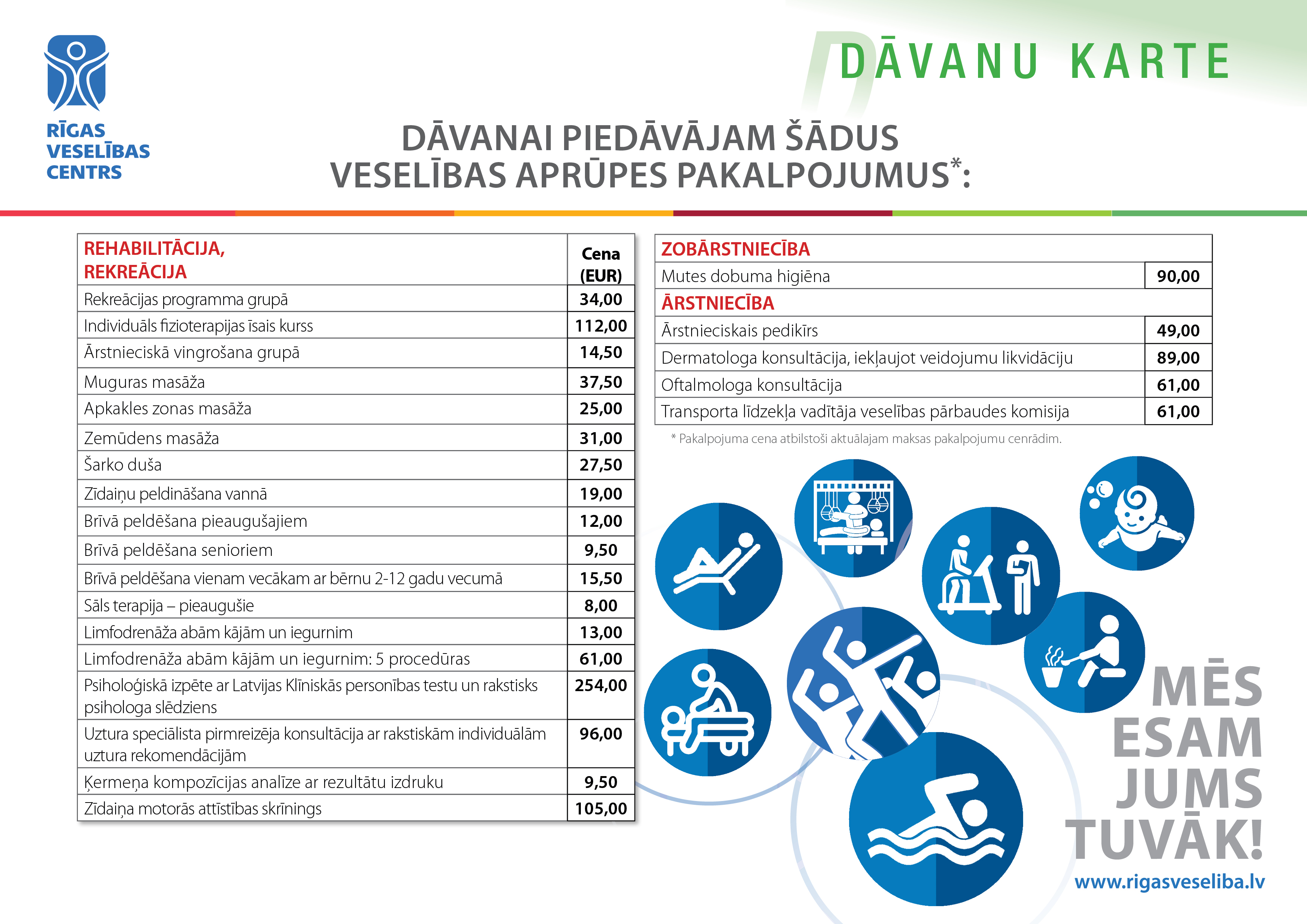 SIA “Rīgas veselības centrs” piedāvā Jums rūpēties par savu vai Jums svarīgu, mīļu cilvēku veselību un iegādāties dāvanu karti kādam no veselības aprūpes pakalpojumiem sešās filiālēs Rīgā – Bolderājā, Iļģuciemā, Imantā, Ķengaragā, Torņakalnā vai Ziepniekkalnā.