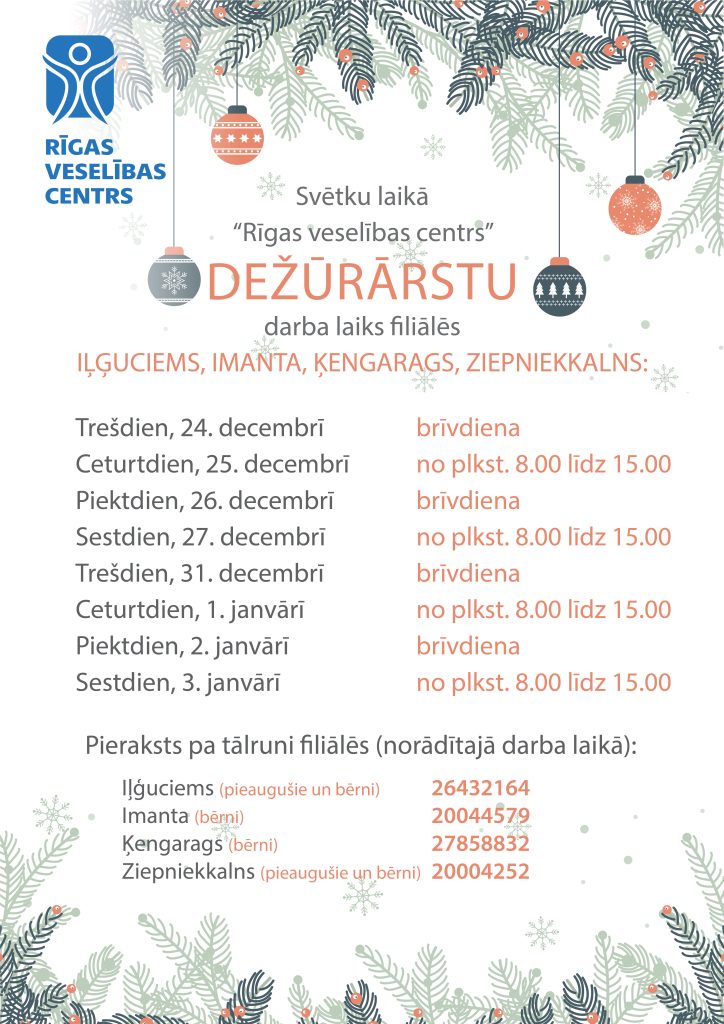 Dežūrārstu darba laiks gada nogalē un janvāra sākumā - Rīgas veselības centrs