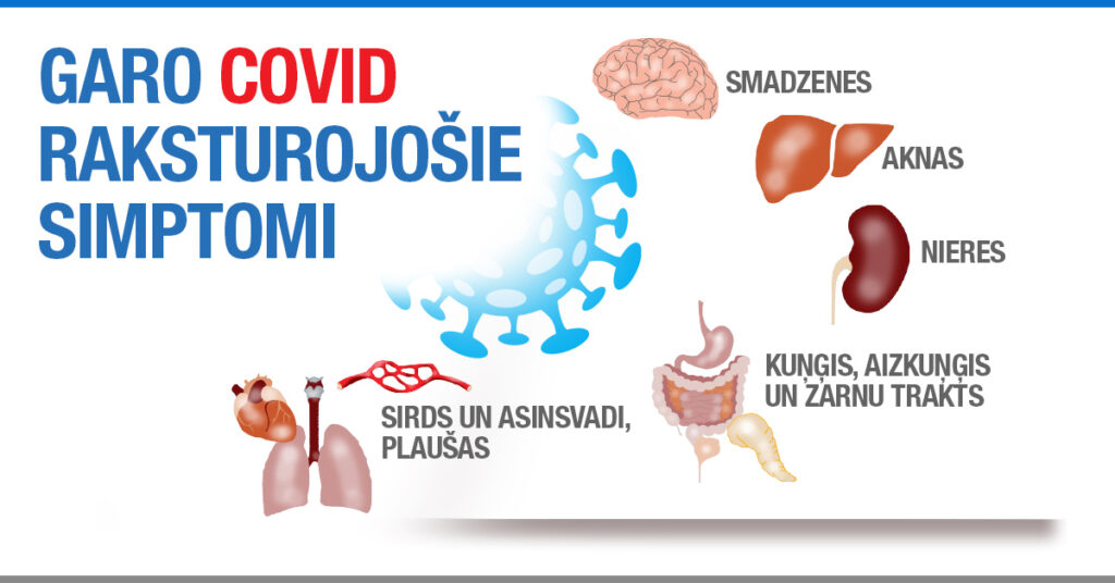 Tāpat kā akūtai Covid-19 infekcijai, arī garajam Covid-19 raksturīgs vairāku orgānu un orgānu sistēmu bojājums – ne tikai elpošanas, bet arī sirds un asinsvadu, nervu, kuņģa-zarnu trakta, muskuļu un skeleta u.c. sistēmas bojājums ar raksturīgiem simptomiem vai simptomu kopām (skat. attēlu).