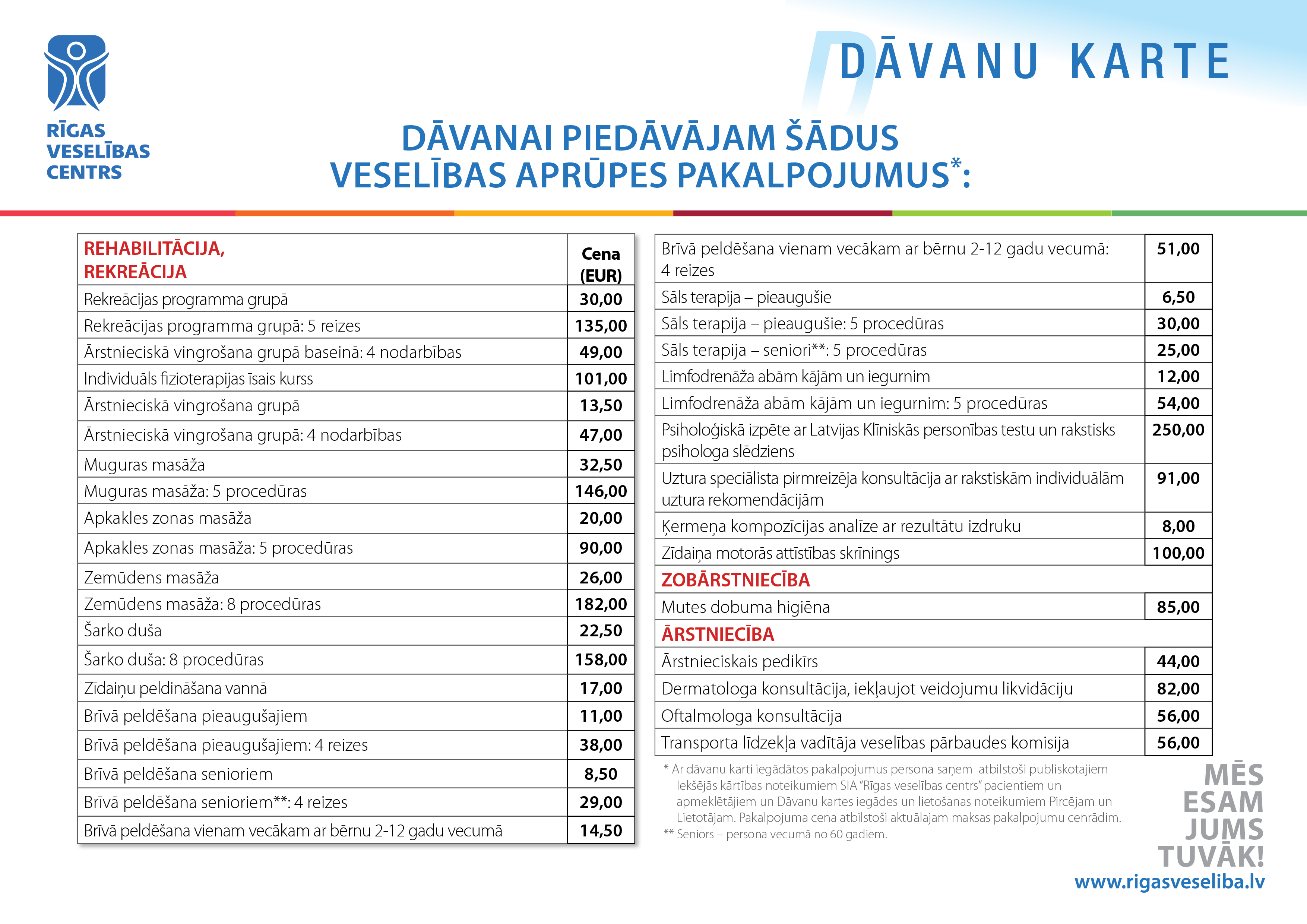 DĀVANU KARTES vērtība – pakalpojumu cenas: