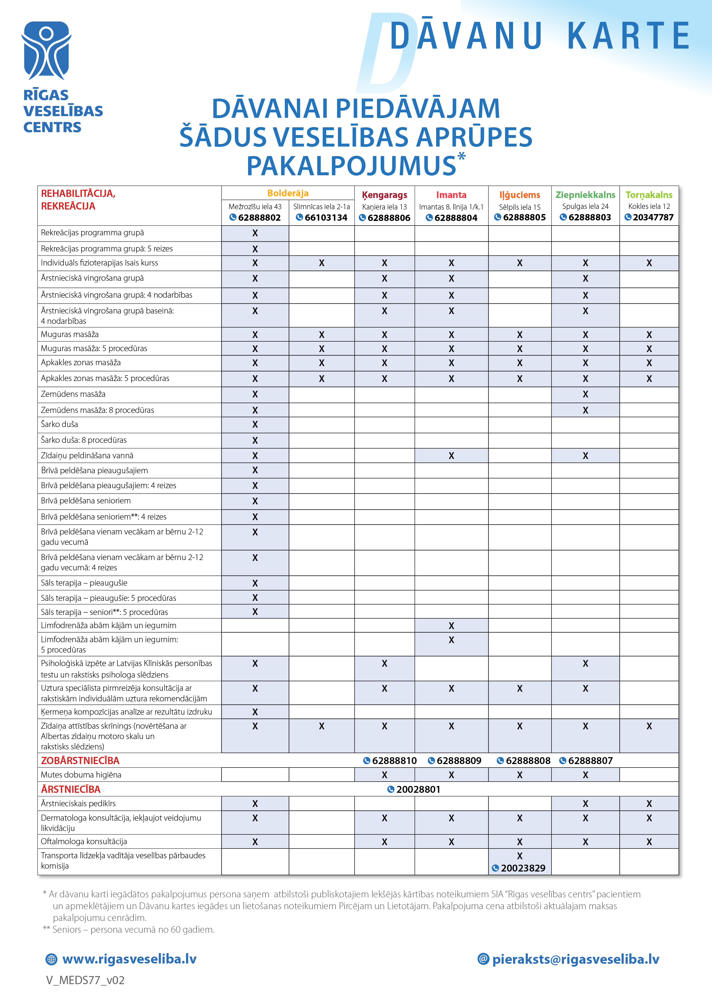 SIA “Rīgas veselības centrs” paplašina pakalpojumu klāstu un piedāvā Jums rūpēties par savu vai Jums svarīgu, mīļu cilvēku veselību un iegādāties dāvanu karti kādam no 35 veselības aprūpes pakalpojumiem sešās filiālēs Rīgā – Bolderājā, Iļģuciemā, Imantā, Ķengaragā, Torņakalnā vai Ziepniekkalnā.